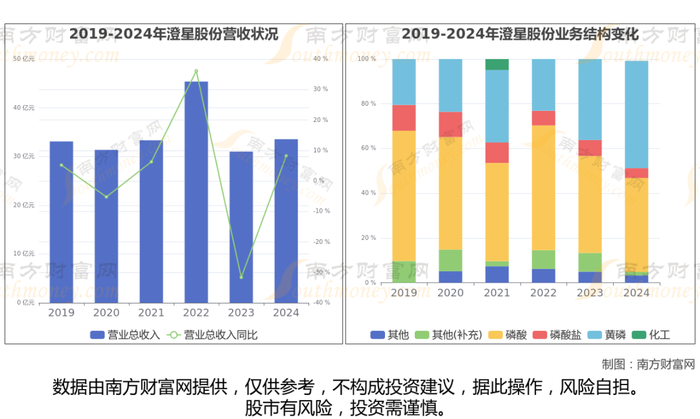 根据公司年度数据显示(如上图),2024年,澄星股份实现营业总收入33.56亿,同比增长8.22%,近5年复合年增长率1.7%。