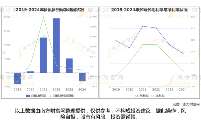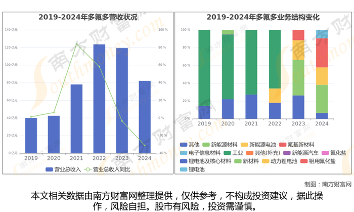 多氟多年报数据显示(如上图),2024年实现营业总收入82.07亿,同比增长-31.25%,近5年复合年增长率17.92%。