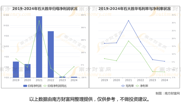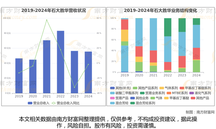 数据显示(如上图),石大胜华公司2024年营业收入55.47亿,同比增长-1.56%,近5年复合年增长率(CAGR)5.51%。