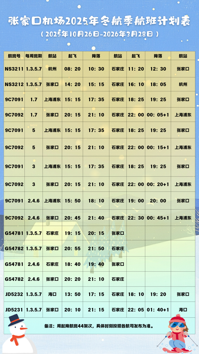 2025年10月26日至2026年3月28日,张家口机场正式执行冬航季航班计划。在新航季中不仅优化了航线网络、升级了中转服务,为商务出行、探亲访友及冰雪运动爱好者打造高效舒适的空中通道。