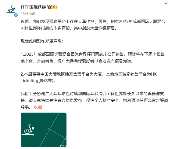 11月8日,ITTF国际乒联发布声明,辟谣代抢门票等不实言论。