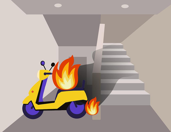 电动自行车停放时,千万不能进楼入户,特别是不能在安全出口、疏散通道这些地方进行停放,一旦发生火灾,会严重影响人员疏散。