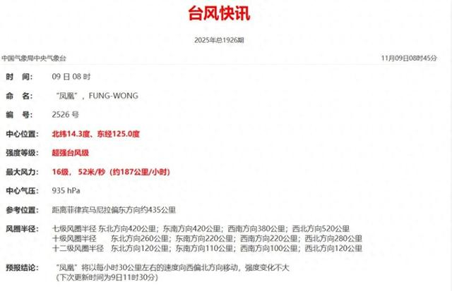 今天早晨5点钟其中心位于菲律宾马尼拉偏东方向大约530公里的西北太平洋洋面上,中心附近最大风力有16级(52米/秒),中心最低气压为935百帕,七级风圈半径400公里~600公里,十级风圈半径240公里~280公里,十二级风圈半径100公里~120公里。