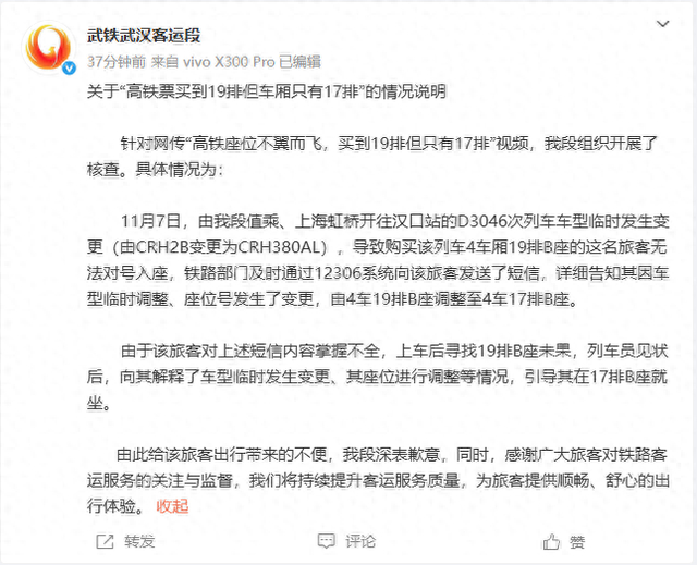 11月9日,@武铁武汉客运段 发布《关于“高铁票买到19排但车厢只有17排”的情况说明》: