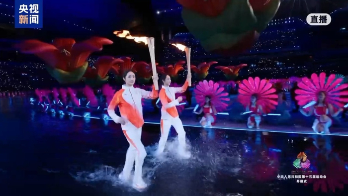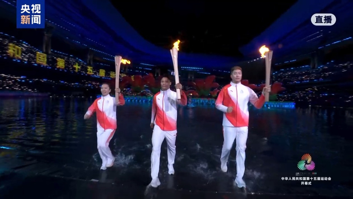 11月9日20时,十五运会开幕式在广东奥林匹克体育中心举行。在开幕式主火炬点燃仪式中,来自全国的优秀运动员代表手持采自南海1522米深处的圣火踏浪而来,经过传递,最终由来自粤港澳三地的火炬手苏炳添、张家朗、李祎最终共同点燃圣火。