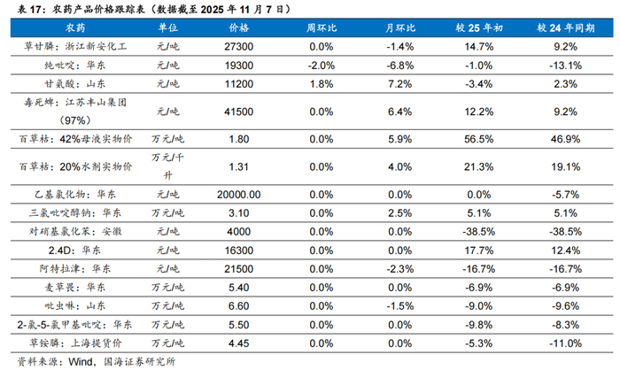 据Wind和百川盈孚,2025年11月7日功夫菊酯原药价格为10.9万元/吨,较10月31日上涨0.3万元/吨;联苯菊酯原药价格为12.9万元/吨,较10月31日上涨0.3万元/吨;草甘膦原药价格为2.73万元/吨,较10月31日持平。