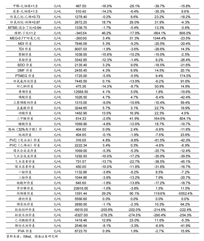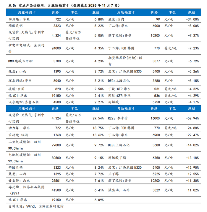 我们跟踪的171种产品的价格中,有31种上涨,占比18.13%,有65种产品下跌,占比38.01%。周涨幅前五的产品分别为:动力煤:华东(6.8%)、动力煤:华东(5.22%)、现货价:天然气:亨利中心交割(5.05%)、锂电池电解液:全国均价(4.35%)、DMC碳酸二甲酯(4.23%)。周跌幅前五的产品分别为:液氯:国内(-34%)、丁二烯:华东(-8%)、顺丁橡胶:齐鲁(-7.27%)、丁二烯:FOB韩国(-7.23%)、期货结算价(连续):沥青(-6.79%)。