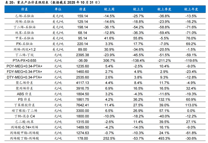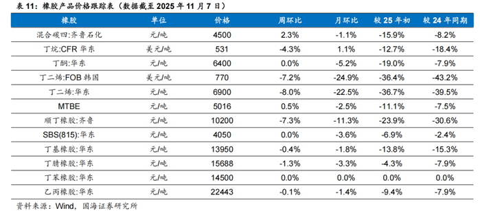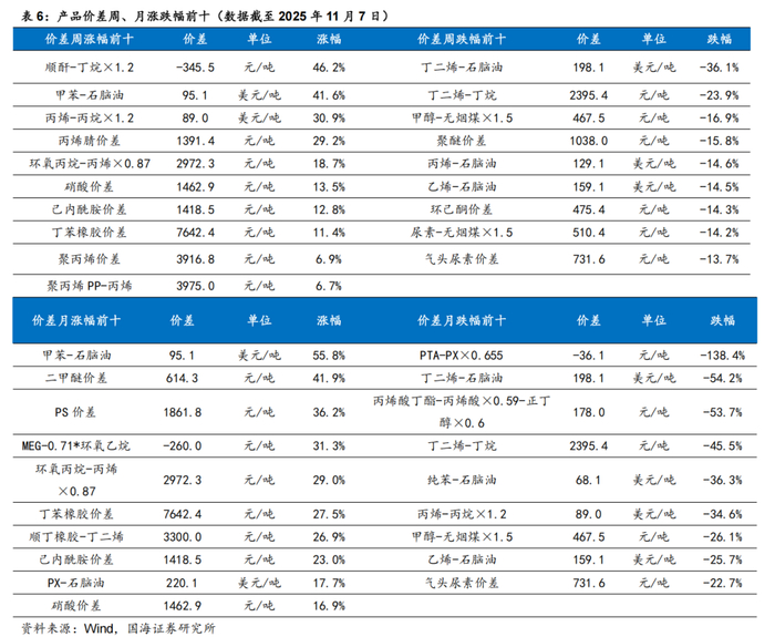 根据Wind,2025年11月6日顺酐价格为4850元/吨,环比10月31日下降170元/吨;据卓创资讯,2025年11月7日丁酮价格为6543元/吨,环比10月31日持平。