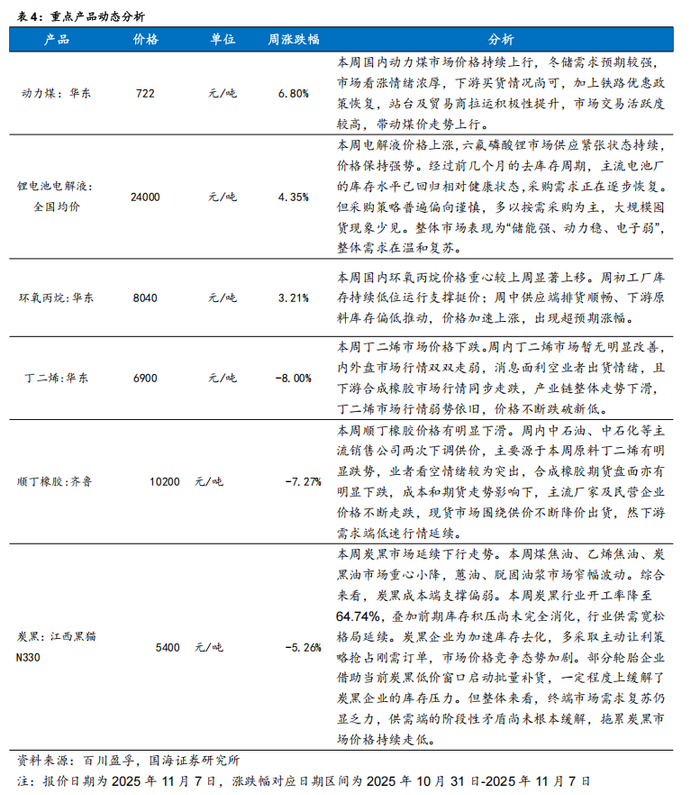 本周(2025年11月31日-2025年11月7日,下同)国内动力煤市场价格持续上行,冬储需求预期较强,市场看涨情绪浓厚,下游买货情况尚可,加上铁路优惠政策恢复,站台及贸易商拉运积极性提升,市场交易活跃度较高,带动煤价走势上行。本周电解液价格上涨,六氟磷酸锂市场供应紧张状态持续,价格保持强势。经过前几个月的去库存周期,主流电池厂的库存水平已回归相对健康状态,采购需求正在逐步恢复。但采购策略普遍偏向谨慎,多以按需采购为主,大规模囤货现象少见。整体市场表现为“储能强、动力稳、电子弱”,整体需求在温和复苏。本周国内环氧丙烷价格重心较上周显著上移。周初工厂库存持续低位运行支撑挺价;周中供应端排货顺畅、下游原料库存偏低推动,价格加速上涨,出现超预期涨幅。本周丁二烯市场价格下跌。周内丁二烯市场暂无明显改善,内外盘市场行情双双走弱,消息面利空业者出货情绪,且下游合成橡胶市场行情同步走跌,产业链整体走势下滑,丁二烯市场行情弱势依旧,价格不断跌破新低。本周顺丁橡胶价格有明显下滑。周内中石油、中石化等主流销售公司两次下调供价,主要源于本周原料丁二烯有明显跌势,业者看空情绪较为突出,合成橡胶期货盘面亦有明显下跌,成本和期货走势影响下,主流厂家及民营企业价格不断走跌,现货市场围绕供价不断降价出货,然下游需求端低迷行情延续。本周炭黑市场延续下行走势。本周煤焦油、乙烯焦油、炭黑油市场重心小降,蒽油、脱固油浆市场窄幅波动。综合来看,炭黑成本端支撑偏弱。本周炭黑行业开工率降至64.74%,叠加前期库存积压尚未完全消化,行业供需宽松格局延续。炭黑企业为加速库存去化,多采取主动让利策略抢占刚需订单,市场价格竞争态势加剧。部分轮胎企业借助当前炭黑低价窗口启动批量补货,一定程度上缓解了炭黑企业的库存压力。但整体来看,终端市场需求复苏仍显乏力,供需端的阶段性矛盾尚未根本缓解,拖累炭黑市场价格持续走低。