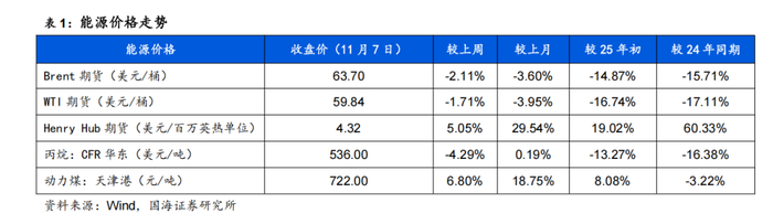 本周(2025年10月31日-2025年11月7日,下同)国内动力煤市场价格持续上行,冬储需求预期较强,市场看涨情绪浓厚,下游买货情况尚可,加上铁路优惠政策恢复,站台及贸易商拉运积极性提升,市场交易活跃度较高,带动煤价走势上行。本周电解液价格上涨,六氟磷酸锂市场供应紧张状态持续,价格保持强势。经过前几个月的去库存周期,主流电池厂的库存水平已回归相对健康状态,采购需求正在逐步恢复。但采购策略普遍偏向谨慎,多以按需采购为主,大规模囤货现象少见。整体市场表现为“储能强、动力稳、电子弱”,整体需求在温和复苏。本周国内环氧丙烷价格重心较上周显著上移。周初工厂库存持续低位运行支撑挺价;周中供应端排货顺畅、下游原料库存偏低推动,价格加速上涨,出现超预期涨幅。