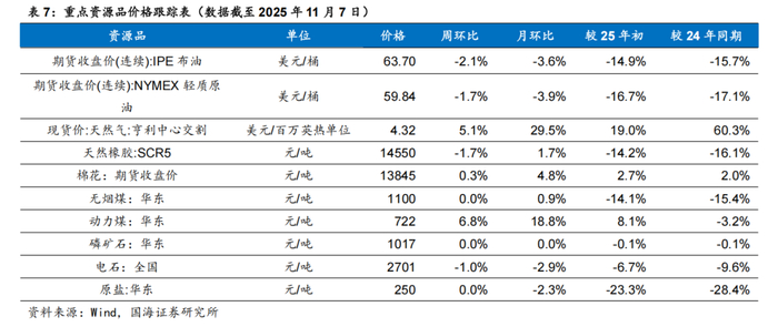 据Wind,截至本周,Brent和WTI期货价格分别收于63.7和59.84美元/桶,周环比-2.11%和-1.71%。