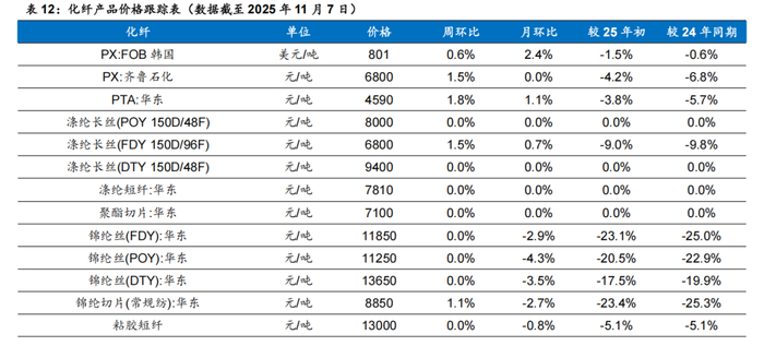 据Wind和卓创资讯,2025年11月7日,涤纶长丝库存天数为16.5天,较10月30日上涨3天。2025年11月7日,PTA库存为407.2万吨,较10月31日上涨1.7万吨。涤纶长丝POY价格为6550元/吨,较10月31日上涨100元/吨;PTA 价格为4570元/吨,较10月31日上涨60元/吨。