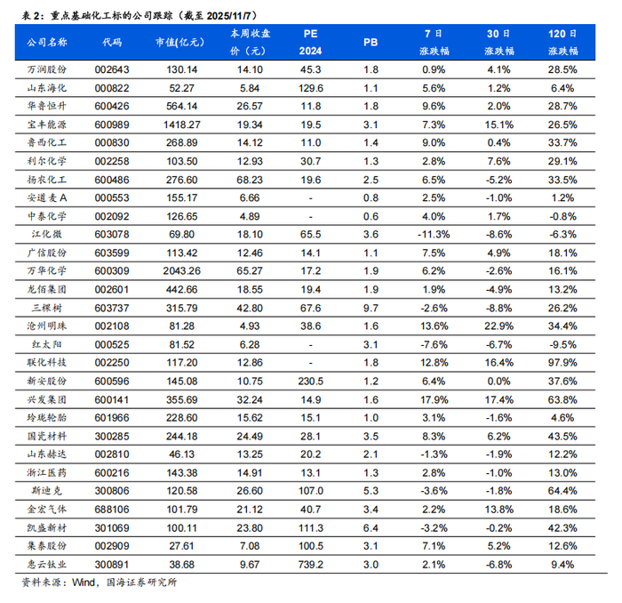 本周(2025年11月31日-11月7日,下同)基础化工(中信)指数涨跌幅为3.62%,沪深300指数涨跌幅为0.82%,基础化工跑赢沪深300指数2.8%。年初至今,基础化工指数涨跌幅为37.05%,沪深300指数涨跌幅为18.9%,基础化工指数跑赢沪深300指数18.15%。