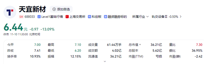 二级市场上,11月10日,天宜新材跌超13%,报6.44元/股,较历史高点跌幅超90%。