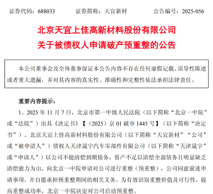 11月9日晚,天宜新材(688033.SH)发布公告,披露公司已于11月7日收到北京市第一中级人民法院出具的《决定书》,因债权人天津晟宇汽车零部件有限公司申请,法院正式决定对其启动预重整程序。