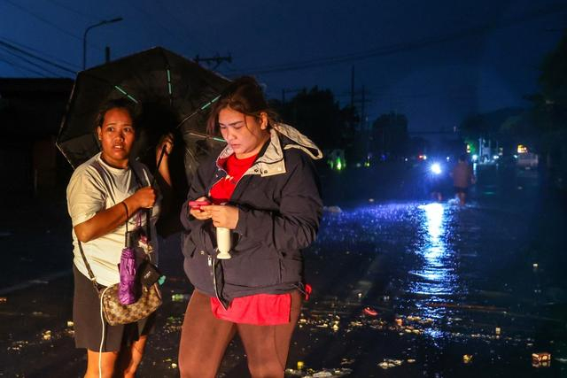 11月10日,菲律宾马尼拉,两名妇女在停电的洪涝地区等待洪水退去。