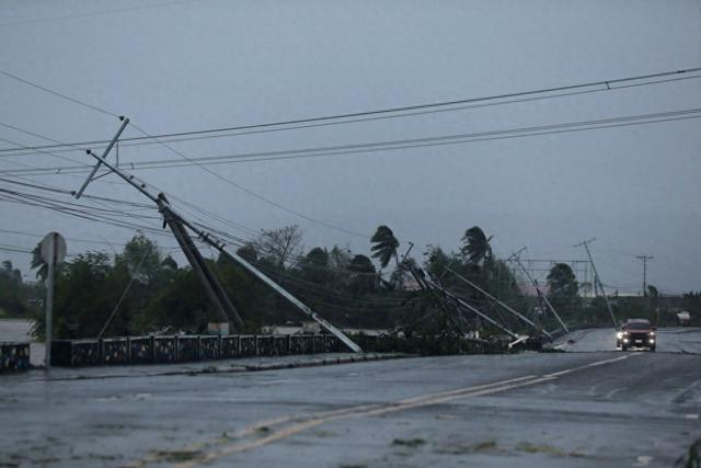 11月9日,菲律宾马尼拉,超强台风“凤凰”登陆后,车辆驶过高速公路旁受损的电线杆。
