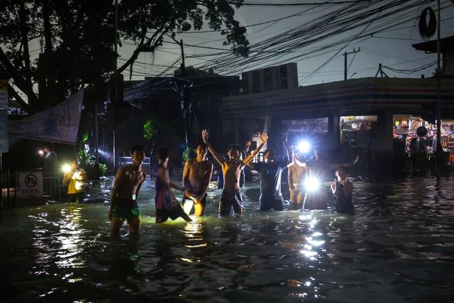 11月10日,菲律宾马尼拉大都会,超级台风“凤凰”造成该国洪水、停电。停电期间,年轻志愿者在被洪水淹没的街道上引导车辆。
