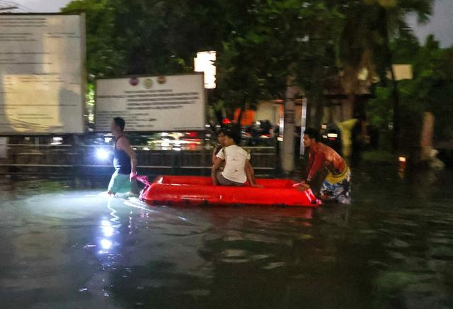 11月10日,菲律宾马尼拉大都会区,民众乘橡皮艇从被洪水淹没的地区撤离。