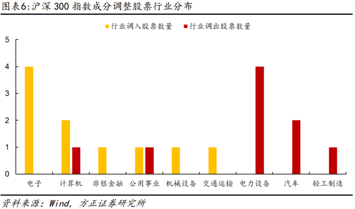从行业分布的角度来看,我们可以发现预测调入沪深300指数的股票行业分布在电子、计算机和非银等行业,相比之下,预测调出沪深300指数的股票主要分布在电力设备、汽车和轻工制造等行业。