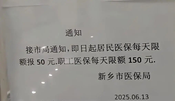 据华商报大风新闻,近日,有河南新乡网友在当地一医院就诊时发现,院内贴出一则通知称:“接市局通知,即日起居民医保每天限额报50元,职工医保每天限额150元。”该通知落款为新乡市医保局,时间为2025年6月13日。此事引发网友关注。