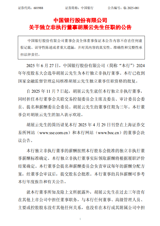 11月10日金融一线消息,中国银行发布公告称,2025年6月27日,该行2024年股东周年大会选举胡展云先生为该行独立非执行董事。该行已收到国家金融监督管理总局核准胡展云先生独立董事任职资格的批复。自2025年11月7日起,胡展云先生就任该行独立非执行董事,同时担任该行董事会关联交易控制委员会主席及委员、审计委员会委员、提名和薪酬委员会委员。