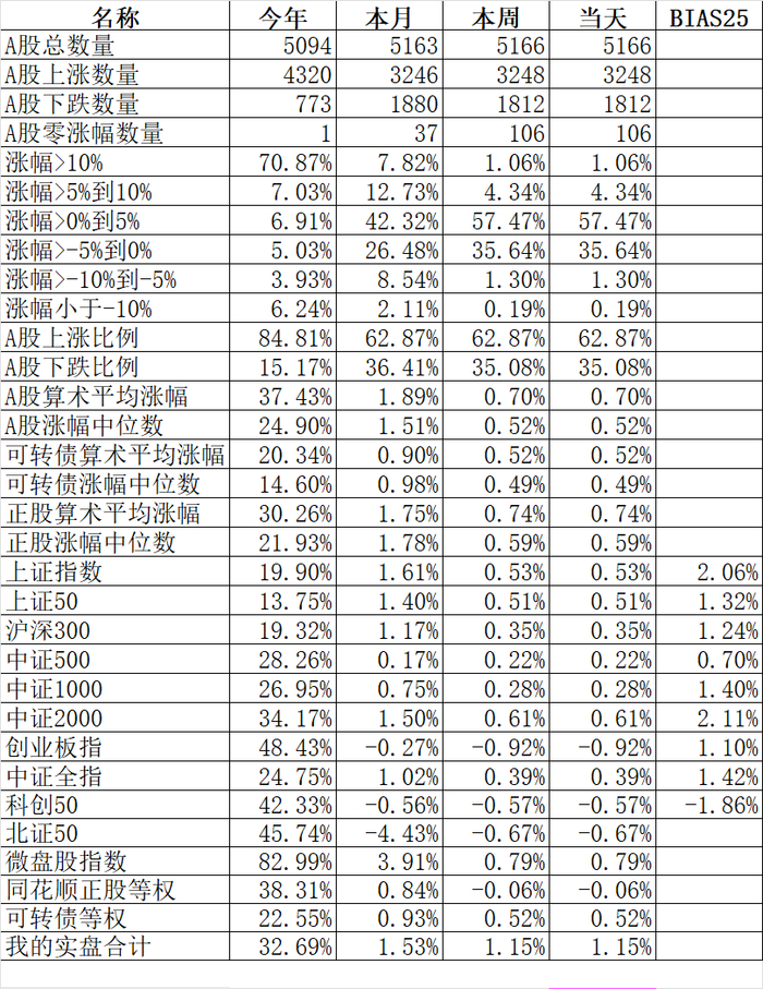 402只可转债平均上涨0.52%,对应正股平均上涨0.74%。我的主仓20只可转债平均上涨1.19%,对应正股平均上涨1.63%。