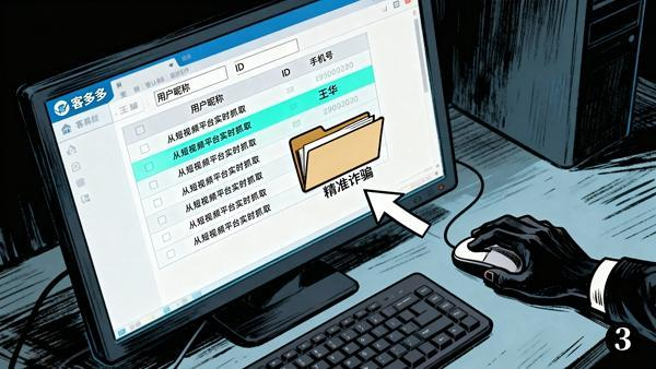 警方追查发现,这背后是一款名为“客多多”的“暴力获客”软件在暗中运作。它可以突破短视频平台的安全防护机制,实时抓取直播间观众的昵称、ID、粉丝数、性别、手机号、所在城市、唯一身份识别码等隐私信息,然后精准推销广告,甚至实施诈骗。