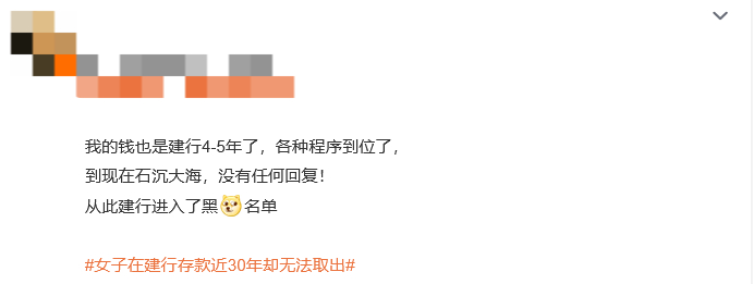 还有网友表示自己也遭遇了相似的困扰:“我的钱也是建行4-5年了,各种程序到位了,到现在石沉大海,没有任何回复!”