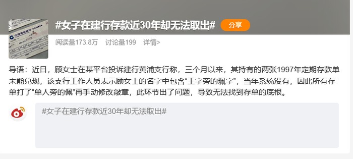 “女子在建行存款近30年却无法取出”上热搜!网友:要经常去银行看一下存款