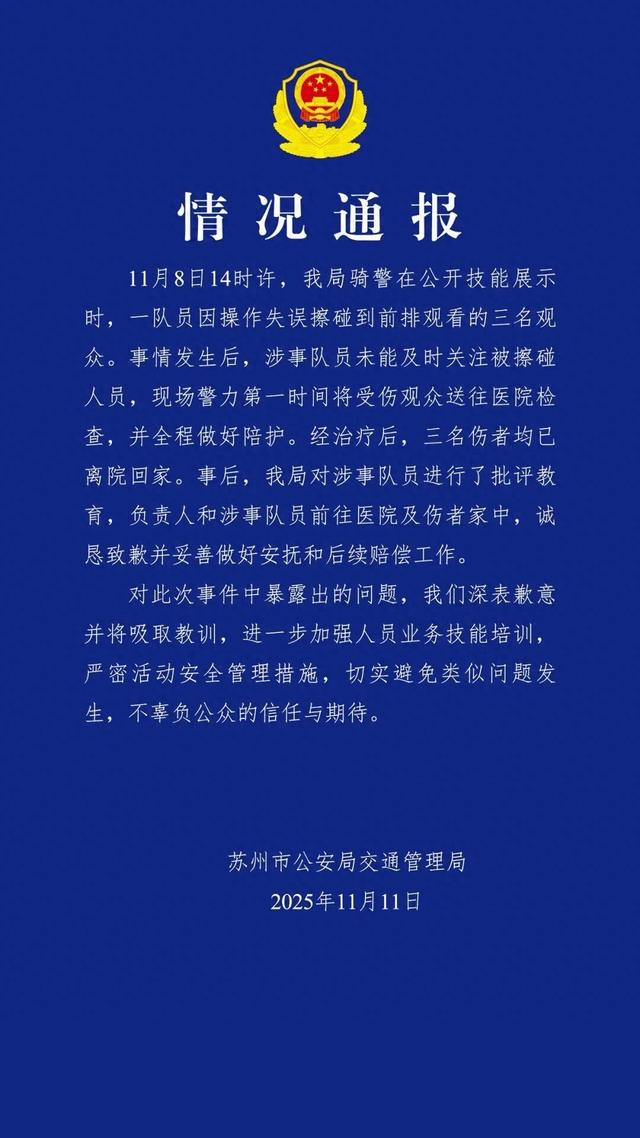 11月8日14时许,我局骑警在公开技能展示时,一队员因操作失误擦碰到前排观看的三名观众。事情发生后,涉事队员未能及时关注被擦碰人员,现场警力第一时间将受伤观众送往医院检查,并全程做好陪护。经治疗后,三名伤者均已离院回家。事后,我局对涉事队员进行了批评教育,负责人和涉事队员前往医院及伤者家中,诚恳致歉并妥善做好安抚和后续赔偿工作。