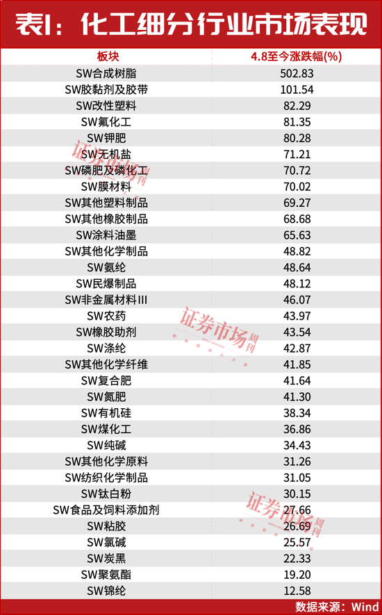 具体至子行业,化工板块统计期内全线上涨,合成树脂、胶黏剂及胶带的涨势最猛,4月8日以来均已实现翻倍上涨(见表1),上纬新材为合成树脂板块的大涨提供了实质性推动,搭上机器人概念,公司股价迎来暴涨,年涨幅已超15倍。同期,惠柏新材、中研股份、永悦科技、兴业股份等合成树脂概念股也均涨势不俗,4月8日以来已相继斩获超50%的阶段涨幅。锦纶、聚氨酯等化工细分行业期间也实现了上涨。