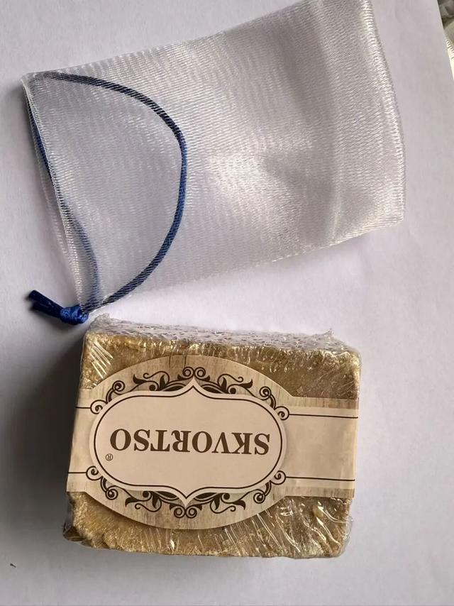 收到货后,该产品实物包装显示,香皂主体裹有透明塑料膜,表面贴有装饰性标签,旁侧配有带蓝色束绳的透明网袋。香皂背面的中文信息标签,商品名称、主要成分(橄榄油、月桂油)、进口商、生产日期(1992年制),并将保质期标注为“未开封不过期”,同时包含使用方法、存放要求、注意事项,以及经销商地址、联系电话、商品条形码等信息。