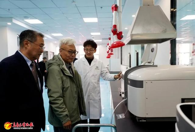 在两河片区建投两河产业园的新疆恒泰宝利检验检测研究有限公司,工作人员为嘉宾介绍实验室的仪器。