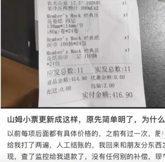 近日,有网友吐槽山姆极速达小票更新后,不再显示每件商品的具体价格,担心会发生重复收款的情况。此事引发关注。
