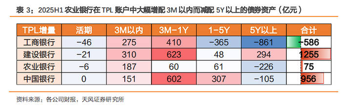 第二,农业银行在TPL账户债券资产的摆布中采取了“控久期”策略。2025年上半年,农业银行新增TPL账户债券资产的期限结构中,3个月以内增加187亿元,而5年以上减少226亿元。这有助于降低公允价值大幅负向波动的风险,在一季度债市大幅调整期间将潜在浮亏控制在较低水平。