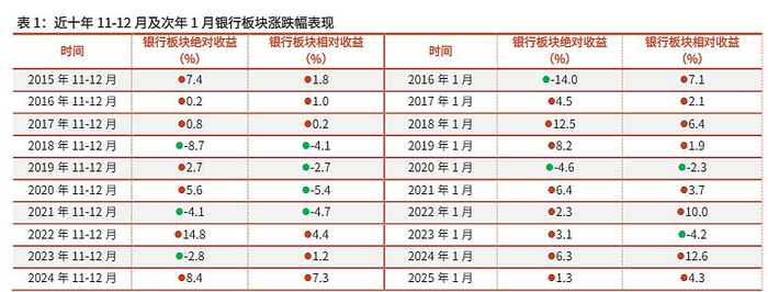 光大证券通过复盘近十年银行板块走势发现,11-12月跑出绝对收益概率达70%,次年1月跑出绝对收益概率达80%,银行股投资进入季节性“顺风期”。数据显示,银行板块在11月至次年1月胜率高且更容易录得较好的相对收益表现。