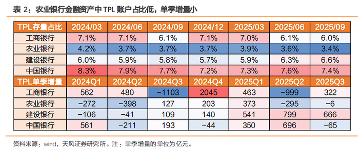 第一,农业银行债券资产中TPL账户占比低、单季增量少,受债市调整影响相对较小。数据显示,自2024年6月末以来,农业银行TPL账户占比长期保持在4%以下,而其他三家大行在6%-8%。今年前三季度,农业银行TPL账户债券资产仅新增72亿元,远低于建设银行的2006亿元和中国银行的981亿元。一季度和三季度的单季增配规模分别为373亿元和-6亿元,也明显低于同业,说明其在市场大幅调整期间交易盘策略较为审慎。