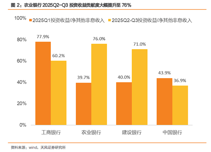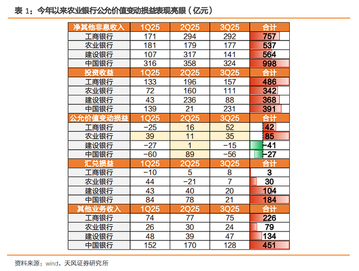 从财报数据来看,2025年前三季度农业银行净其他非息收入同比增长31.7%,领先于建设银行的31.0%、工商银行的27.6%和中国银行的22.2%。特别值得注意的是,在一季度工商银行、建设银行净其他非息收入显著负增长的情况下,农业银行甚至逆势高增45.3%。
