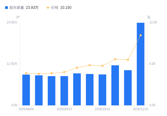 近一年(2024年11月20日至2025年11月10日),海马汽车A股股东户数从10.25万户,增加至23.93万户,增幅133.51%,区间股价上涨119.70%。