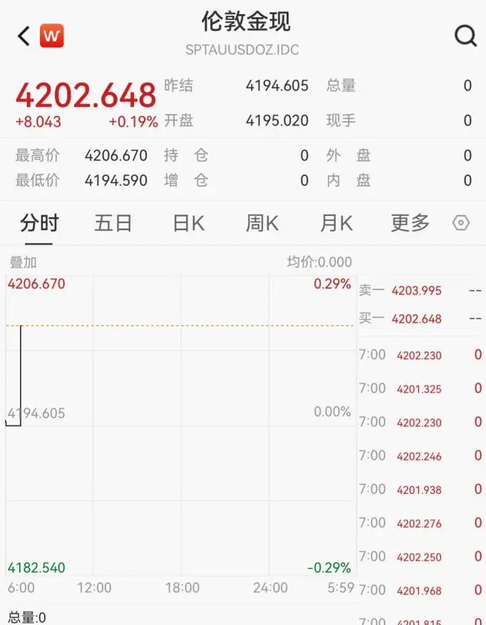 北京时间11月13日早间,现货黄金升破4200美元/盎司。截至记者发稿,现货黄金报4202.648美元/盎司,日内涨0.19%。