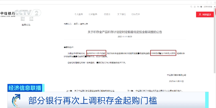 近期,黄金价格波动较大。11月11日,中信银行、建设银行发布公告,再度上调积存金购金门槛。中信银行表示,自2025年11月15日起,将积存金定期积存计划定时定额最低定投金额从1000元调整为1500元。