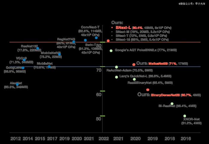 2022年底: 团队推出的BNext-L模型在ImageNet上达到了80.4%的Top-1准确率,比谷歌同期的模型高出3个百分点。这不仅仅是一个数字的突破,它意味着,*压缩的1-bit模型,在精度上首次达到了当时端侧和云端主流部署的ResNet基准线,证明了其在视觉任务上具备了商业落地的可行性。