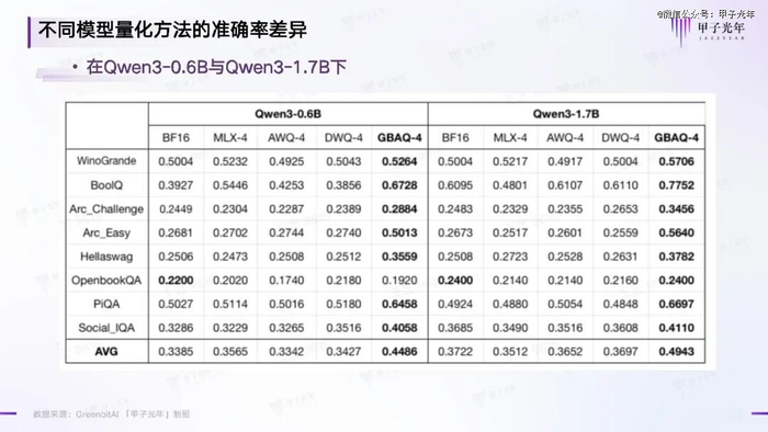 GBAQ算法下的4bit模型与其他量化技术路线在自然语言理解任务上的表现差异 制图:甲子光年