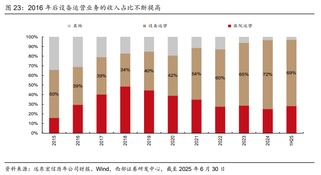 在产业运营分部中,设备运营业务的收入占比不断提高。自2021年起,设备运营业务成为了产业运营业务收入增长的主要来源,其收入占比从2020年的42%上升到2024年的的72%,2025H由于国内业务承压,宏信建发的收入占比有所下降。宏信健康的业务发展较为平稳,收入规模占比相对稳定。