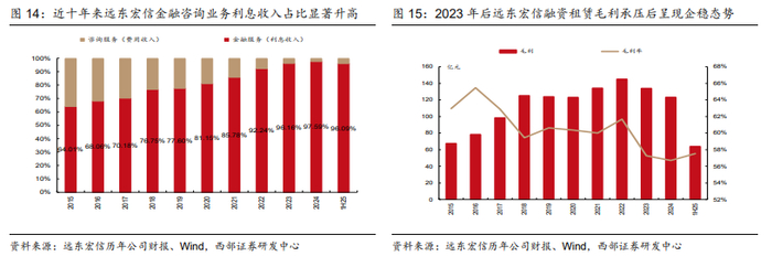 远东宏信利息收入占比不断升高,费类收入占比不断减少。远东宏信金融与咨询业务涵盖金融服务及咨询服务这两类,分别获取利息收入和服务费收入,利息收入为重资本业务,费用收入为轻资本业务。远东宏信所提供的金融服务以融资租赁为主,同时还包含多元化的创新金融服务等,这两者均属于赚取利息的资产负债表业务。因监管要求融资租赁业务回归本源,聚焦主责主业,远东宏信近年来聚焦融资租赁主营业务,收缩咨询等其余金融服务规模。赚取利息收入的金融服务业务收入占比由2015年的64%提升至2025上半年的96%。