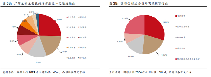 从投向行业方向来看,国银金租主要投向飞机租赁、绿色能源和高端装备租赁行业,江苏金租主要投向清洁能源和交通运输行业,中银航空租赁主要投向飞机租赁,远东宏信主要投向城市服务和医疗行业。截至2024年底,江苏金租存量应收融资租赁款25.54%集中在清洁能源业,18.76%集中于交通运输业;国银金租29.80%集中于飞机租赁业,24.10%集中于绿色能源与高端装备租赁;远东宏信44.21%集中于城市公用行业,15.21%集中于医疗健康行业。