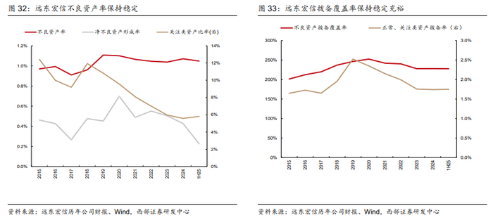 3)资产质量:远东宏信主动压降城市公用类业务规模,不良率保持稳定,且对普惠业务的不良资产100%进行核销,我们预计2025-2027年不良资产比例均为1.05%,拨备覆盖率为227%,和2024年基本持平。