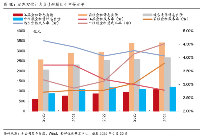 远东宏信由于出色的营销能力,租赁余额跟江苏金租以及中银航空租赁相比处于较高水平。同时由于远东宏信的投放行业较为分散,以及普惠金融业务的大力发展,整体收益率低于以飞机租赁为主要业务的国银金租和中银航空租赁,但整体收益率高于同样以分散行业投放为主要特征的江苏金租。总体来看,2024年生息租赁余额国银金租(3357亿元)>远东宏信(2658亿元)>中银航空租赁(1692亿元)>江苏金租(1278亿元),收益率国银金租(12.60%)>中银航空租赁(9.98%)>远东宏信(9.08%)>江苏金租(6.53%)。