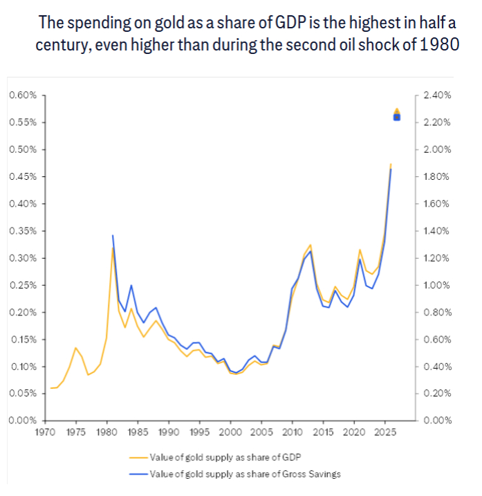 开支占比创纪录: 按4000美元/盎司的价格计算,全球黄金开支占GDP的比重已超过0.55%,这是55年来的最高水平。
